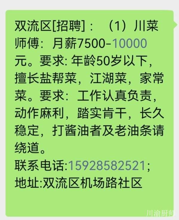 • 双流区[招聘] :(1)川菜师傅:月薪7500-10000元。要求: 年龄50岁以下,擅长盐帮菜,江湖菜,家常菜。要求:工作认真负责,动作麻利,踏实肯干,长久稳定,打酱油者及老油条请绕道。